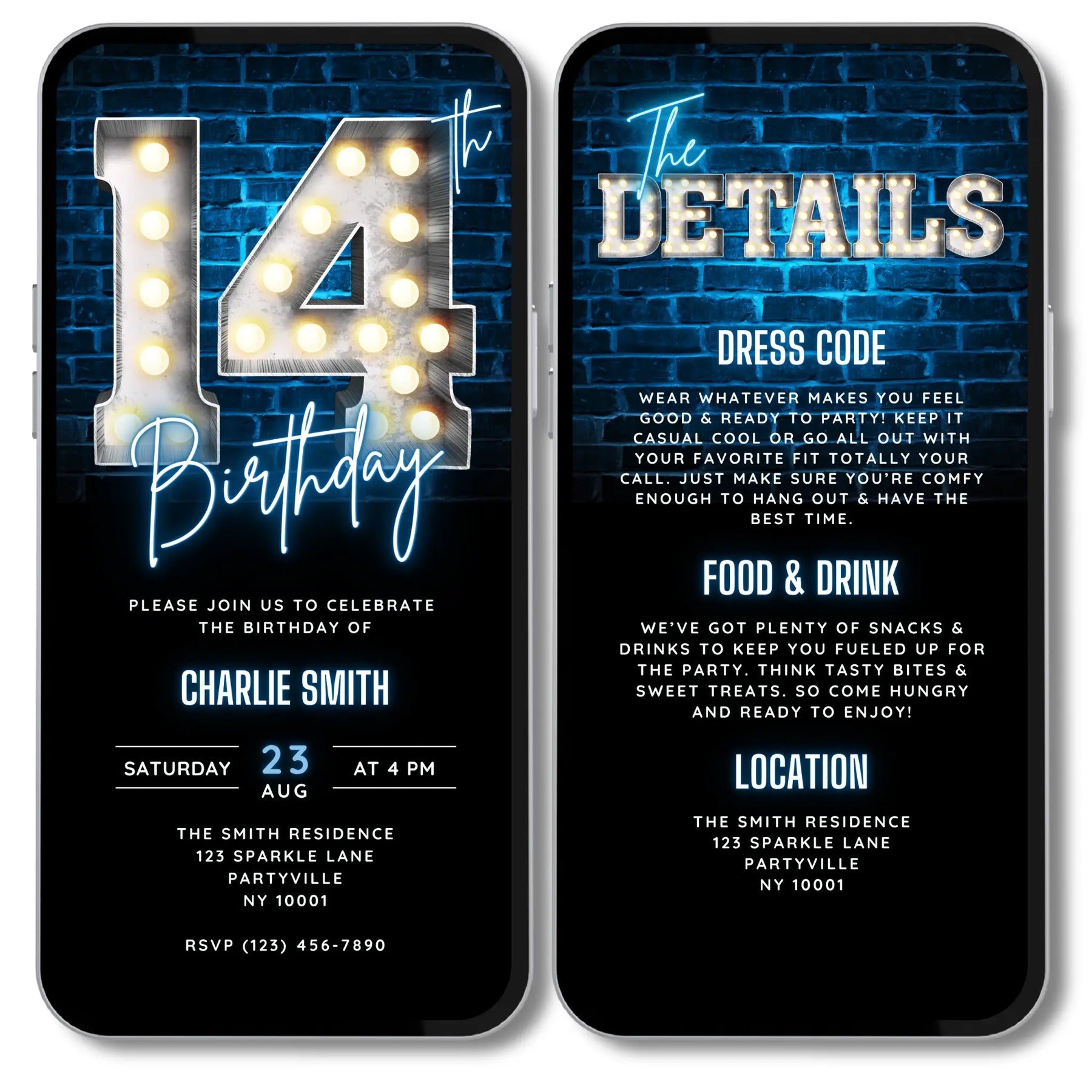 This blue 14th birthday invitation with Details is the perfect way to kick off a fun filled milestone celebration! Designed for boys who want something trendy and cool, this editable Canva template lets you customize details in minutes.