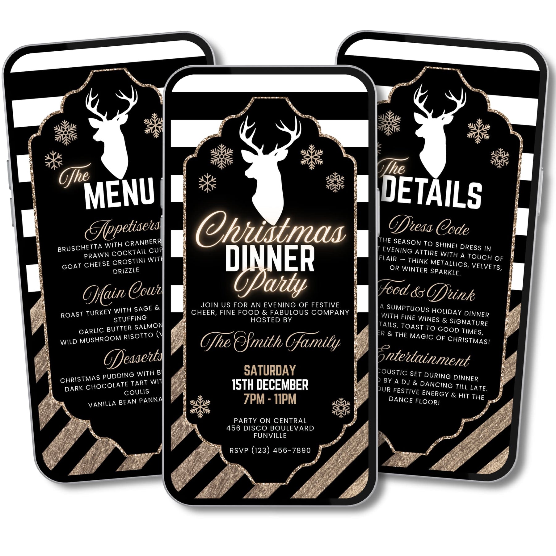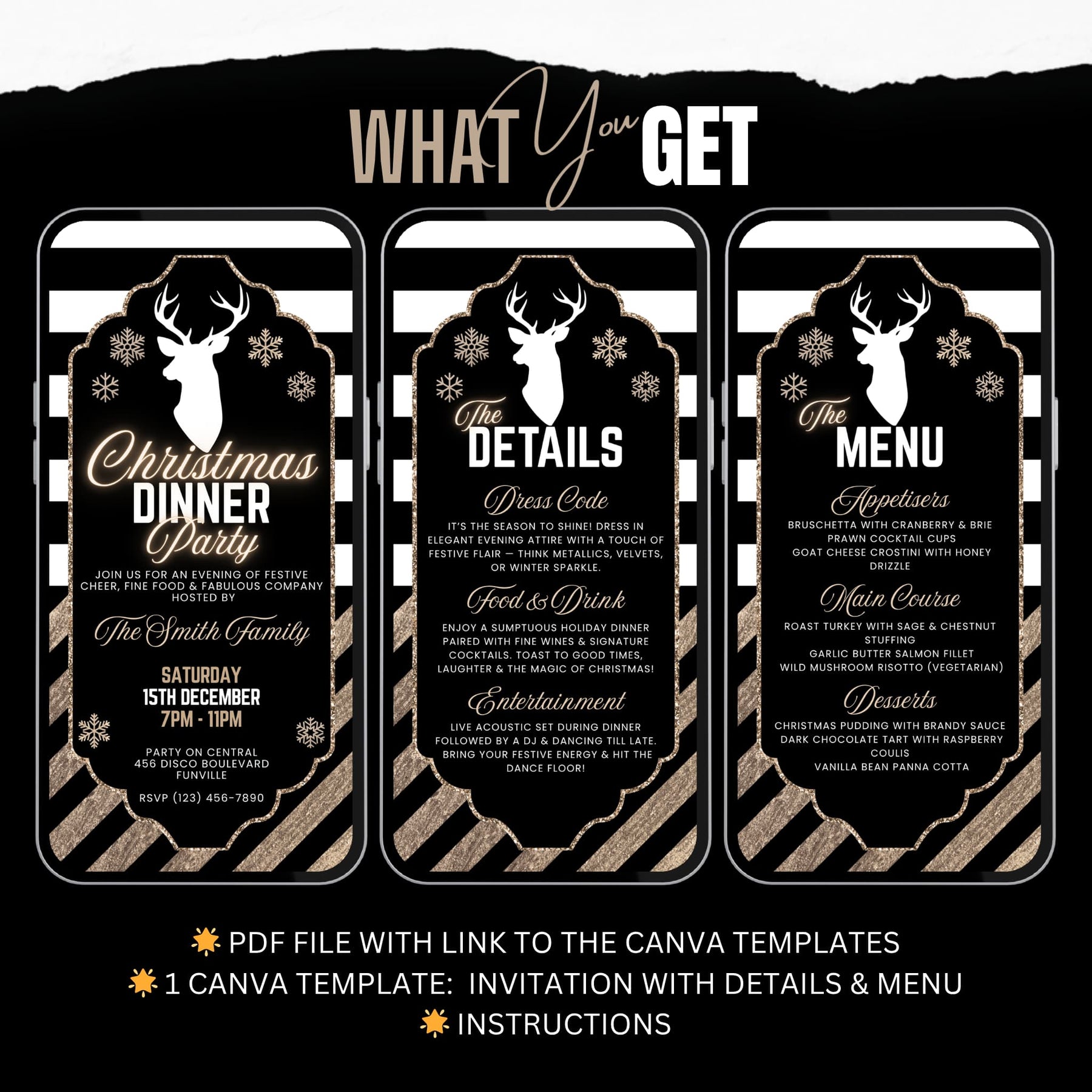 Complete your Christmas soirée with this Black & Gold Christmas Dinner Party template. Includes invitation, details page and menu card - perfect for hosting a festive evening of fine food and glam celebration. Fully editable in Canva and ideal for luxury holiday events or family gatherings.