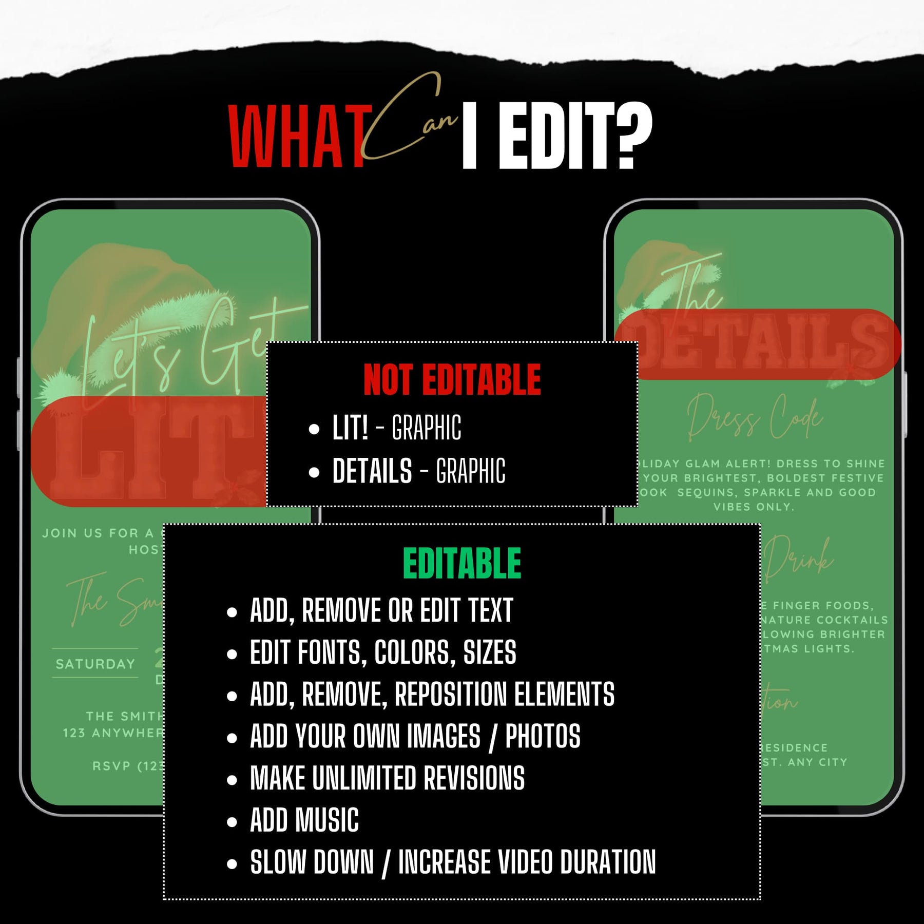 With Canva, you can edit all text, change fonts, adjust colors, resize and move text boxes, and even upload your own images. Once you're happy with your design, you can download it as an MP4 (Video),JPG, PNG, or PDF.