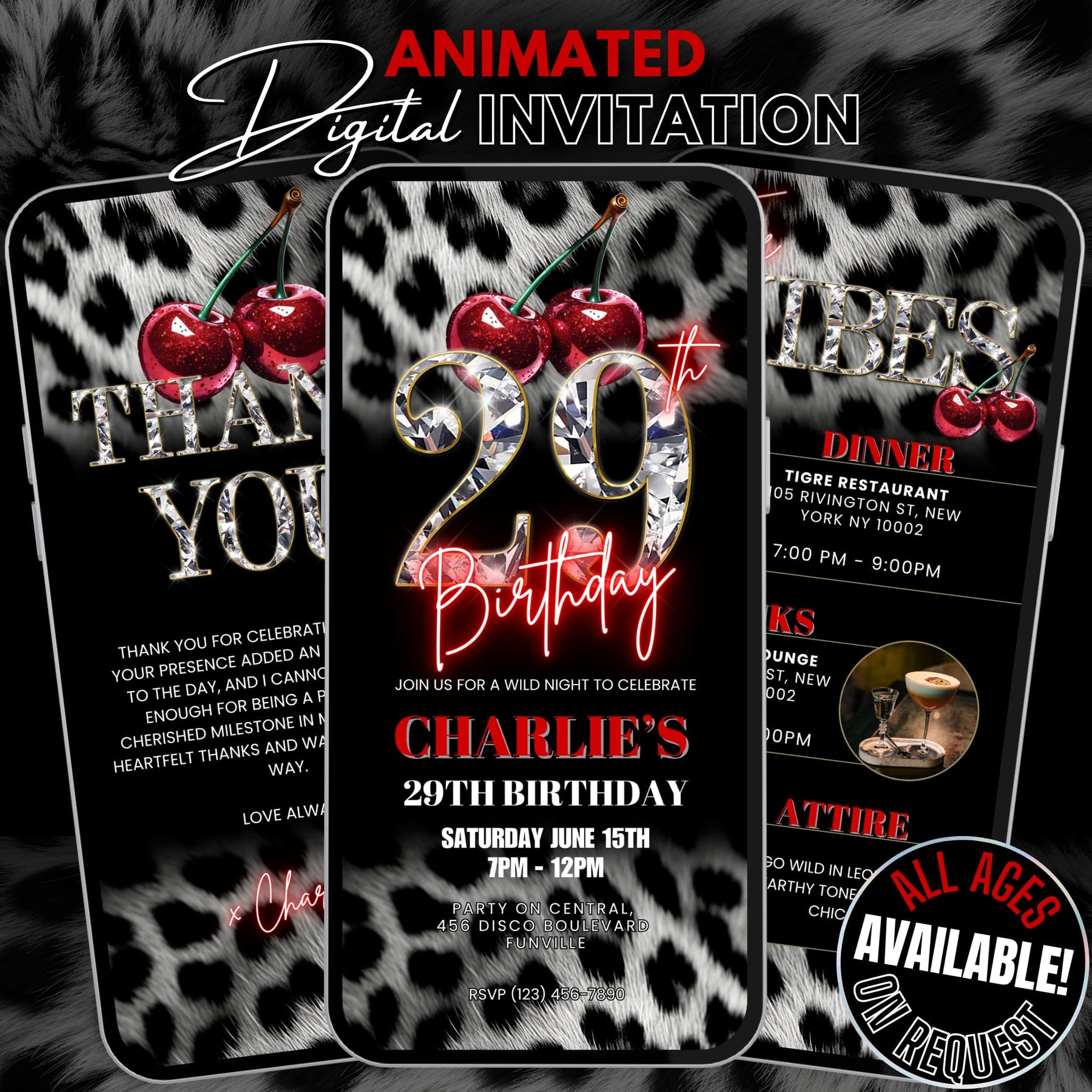 Turn 29 in fierce, cherry red glam style with this animated Cherry, Cheetah & Leopard Print 29th Birthday Invitation Bundle. This pack includes your main invitation with Vibes itinerary and matching Thank You card — everything you need for a luxe, coordinated birthday celebration.