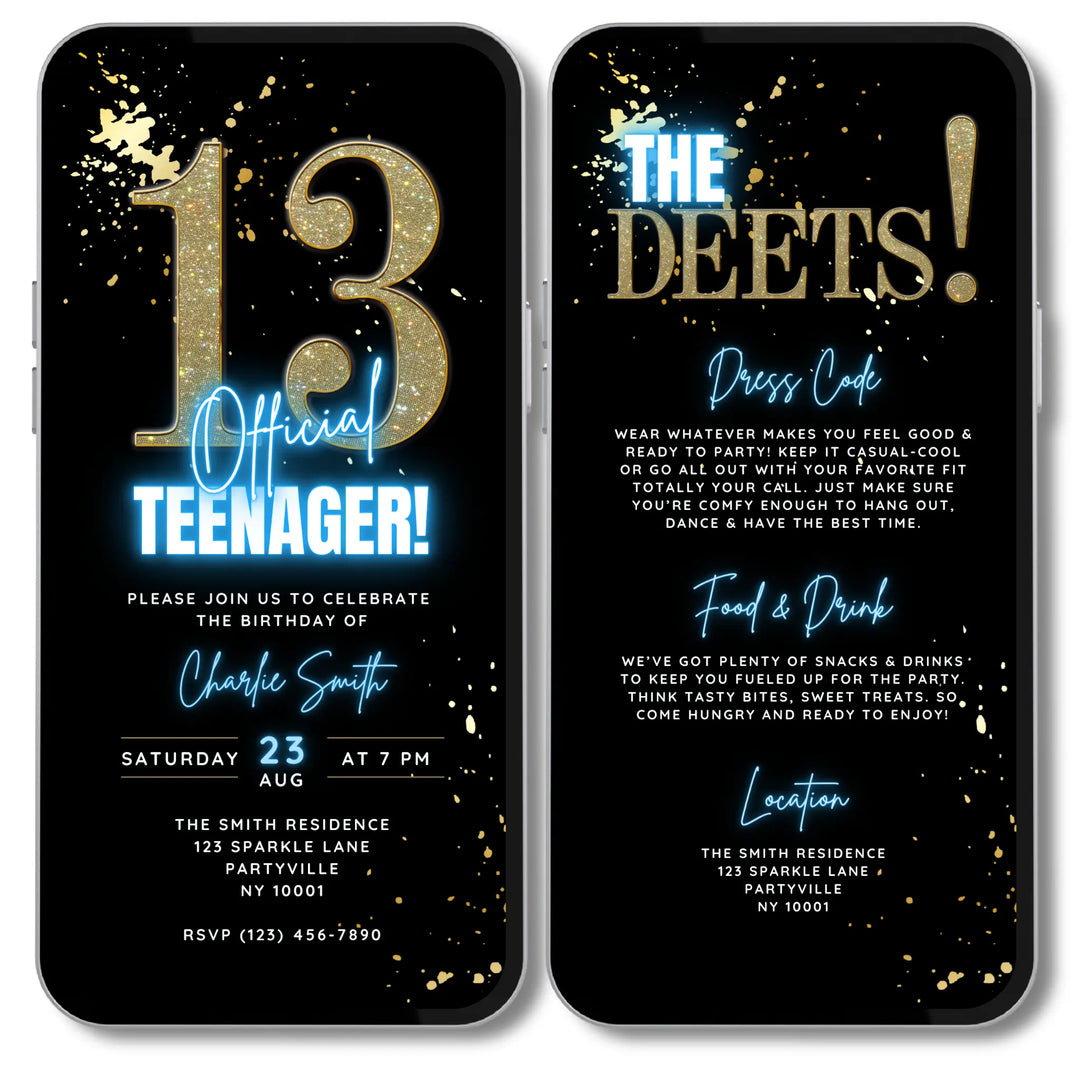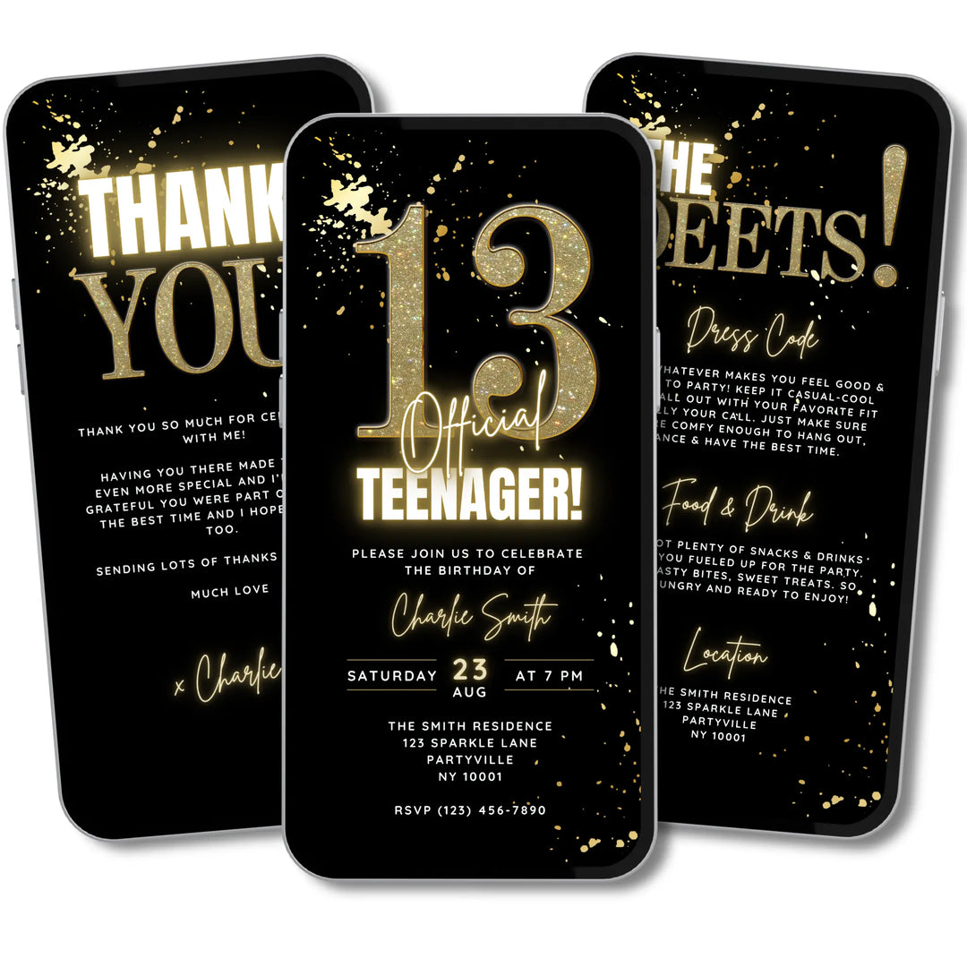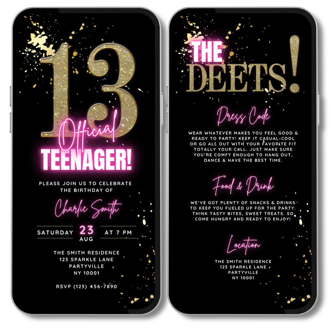 Whether you’re planning a 13th birthday, Sweet 16 or any milestone teen birthday, our digital invitations let you customise details in Canva. Add names, dates, party themes and more — then share instantly on your smartphone via your preferred messaging service I.e. Text, Email, WhatsApp or Social Media.