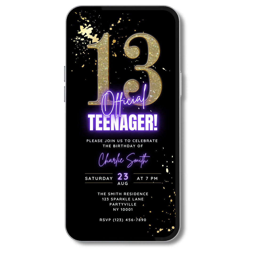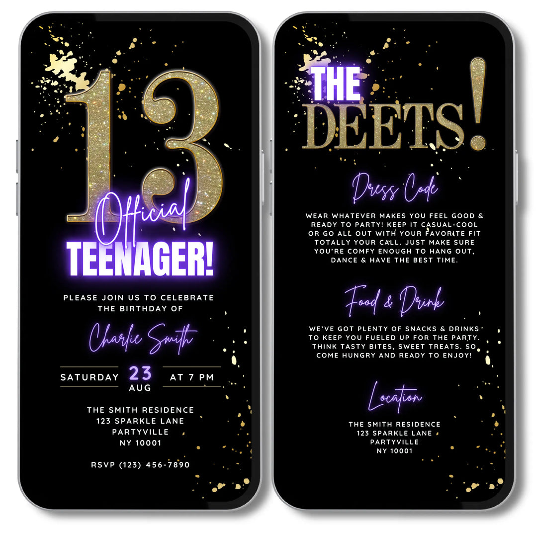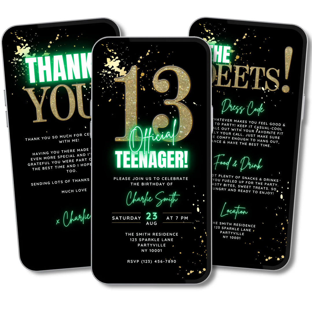 Whether you’re planning a 13th birthday, Sweet 16 or any milestone teen birthday, our digital invitations let you customise details in Canva. Add names, dates, party themes and more — then share instantly on your smartphone via your preferred messaging service I.e. Text, Email, WhatsApp or Social Media.