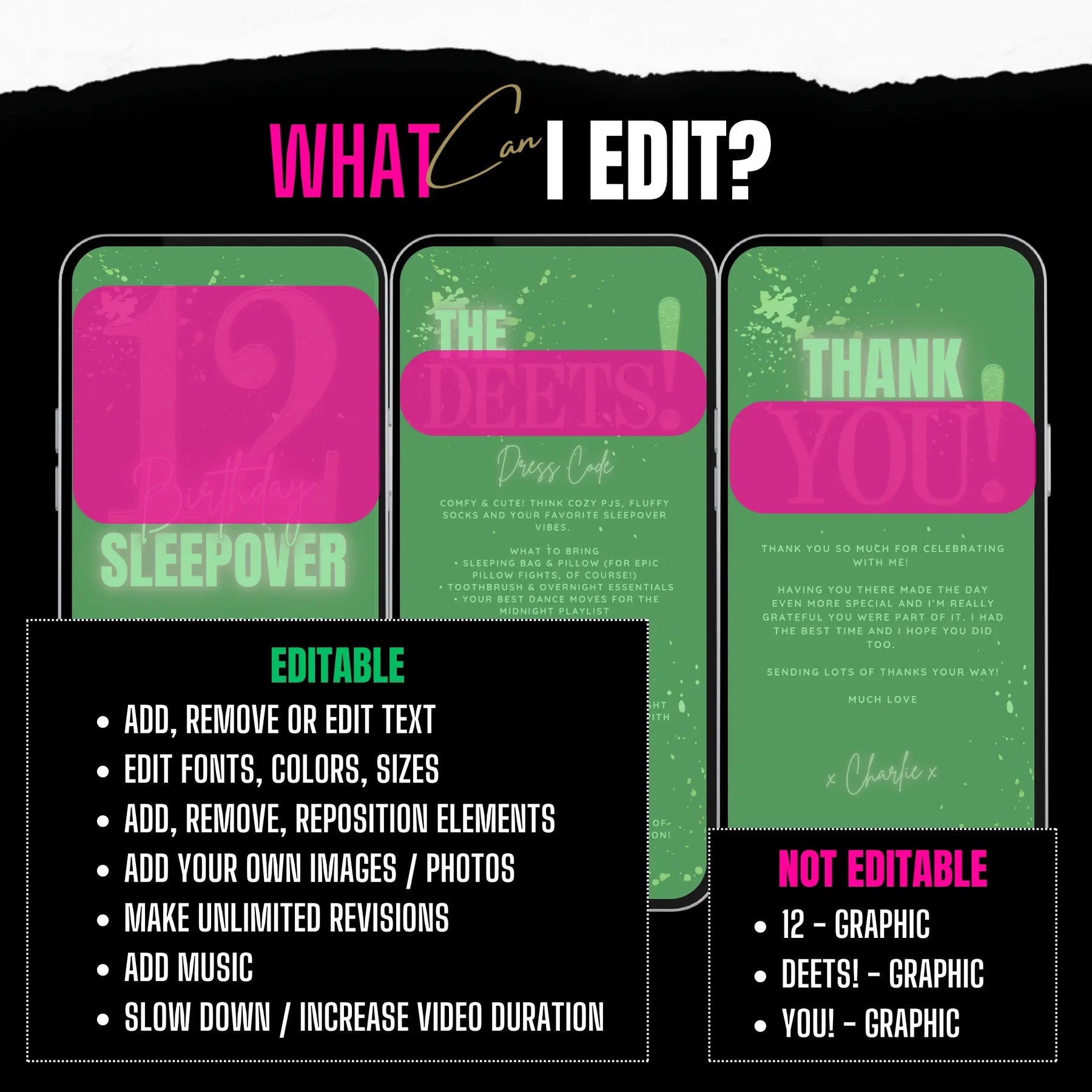 Host the ultimate 12 birthday sleepover with this glam digital invitation set!