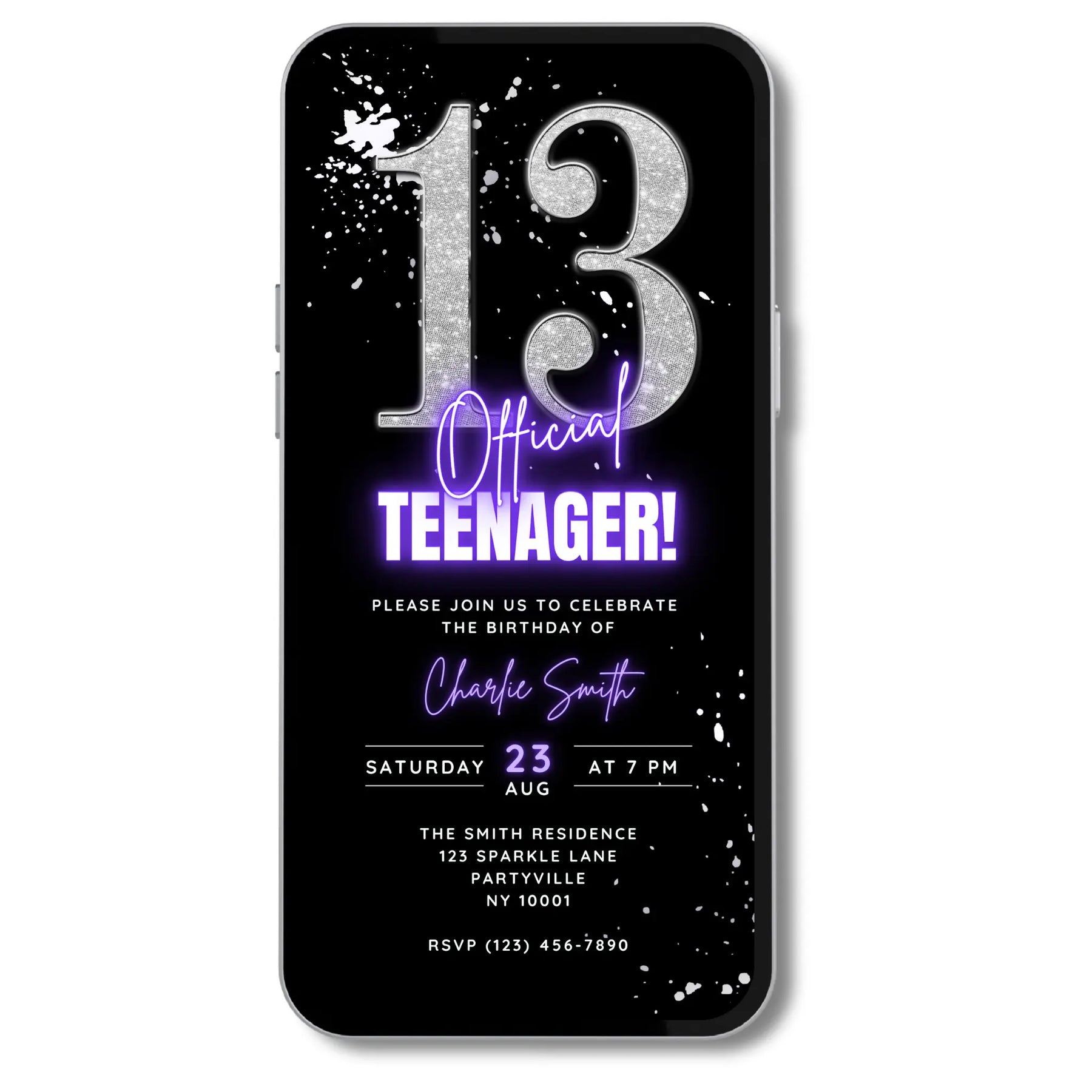 Turn 13 in style with our Purple & Silver Official Teenager Invitation. Bold, fun and editable in Canva, this digital invite is perfect for boys or girls who want a modern & trendy look for their milestone birthday.