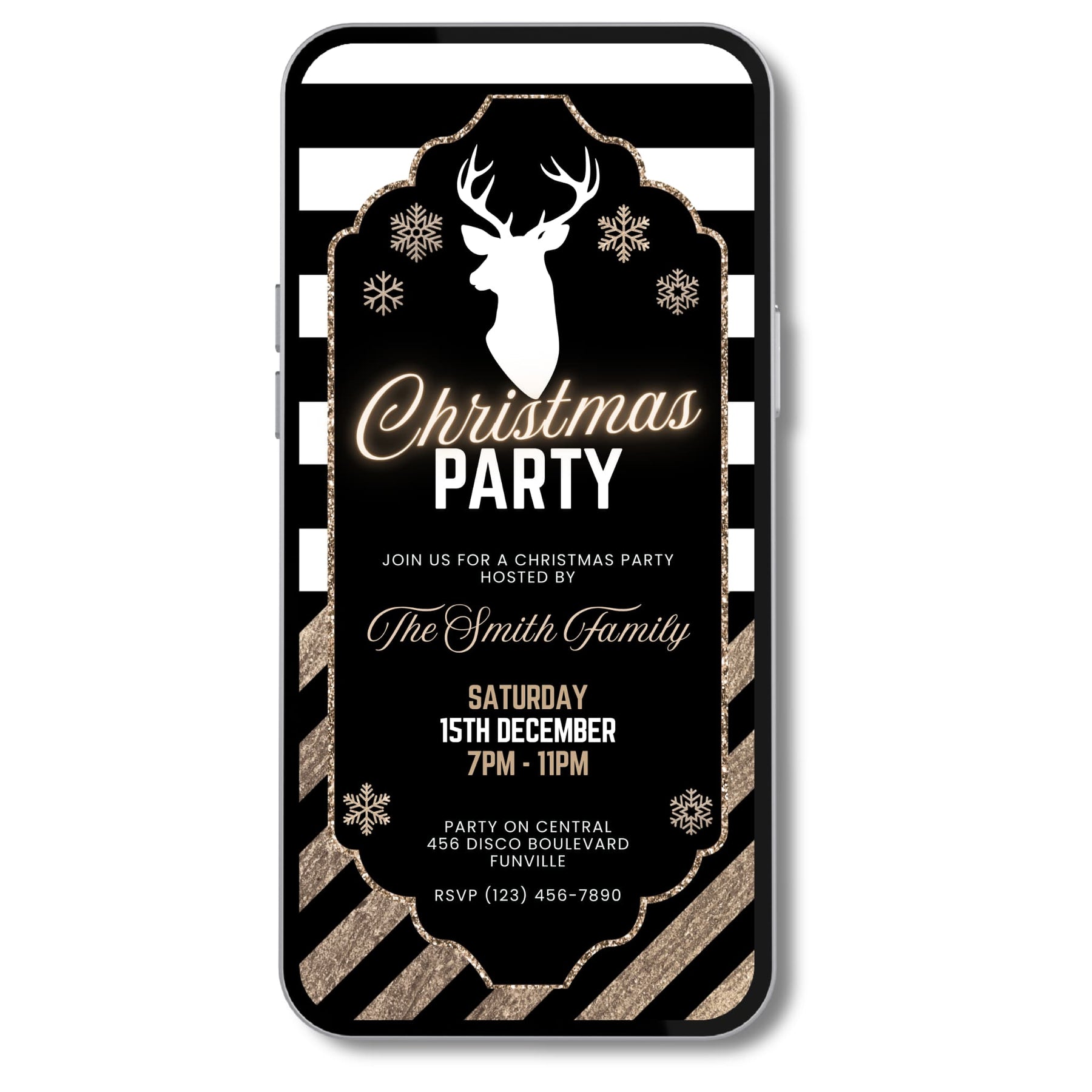 With bold black stripes, glittery gold accents and a classic reindeer silhouette, this invitation sets the tone for a sophisticated and fun night of festive cheer.
