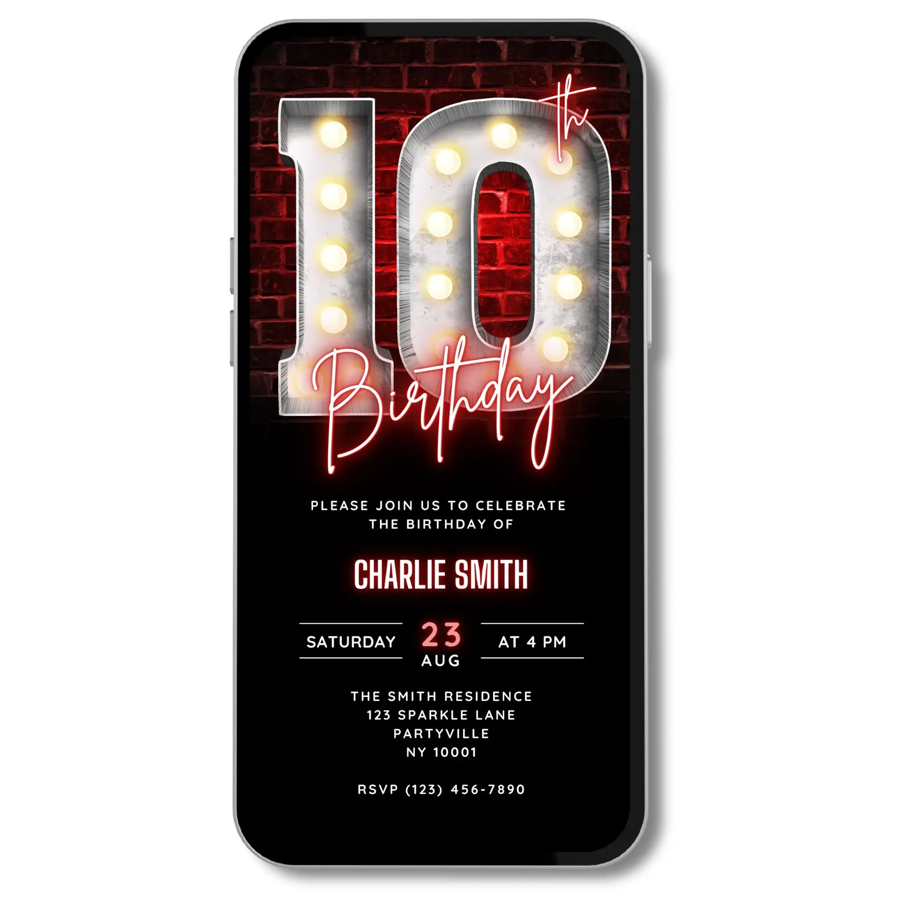 Celebrate in style with this neon red 10th birthday invitation. Designed for boys who love a bold and trendy look, this editable Canva template makes customizing easy.