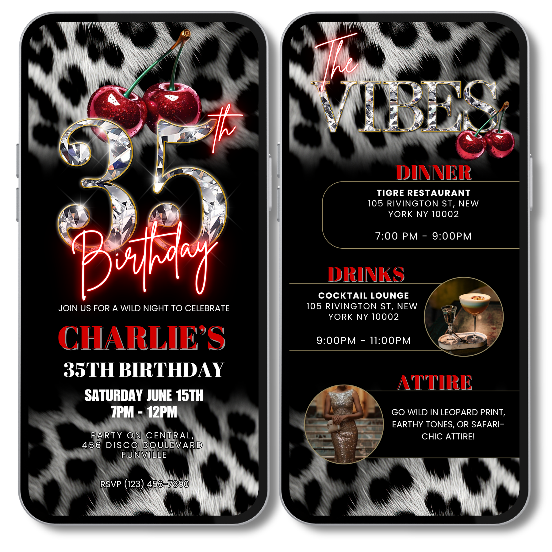 Cherry, Cheetah & Leopard Print 35th Birthday Invitation with Vibes Itinerary | Editable Canva Template