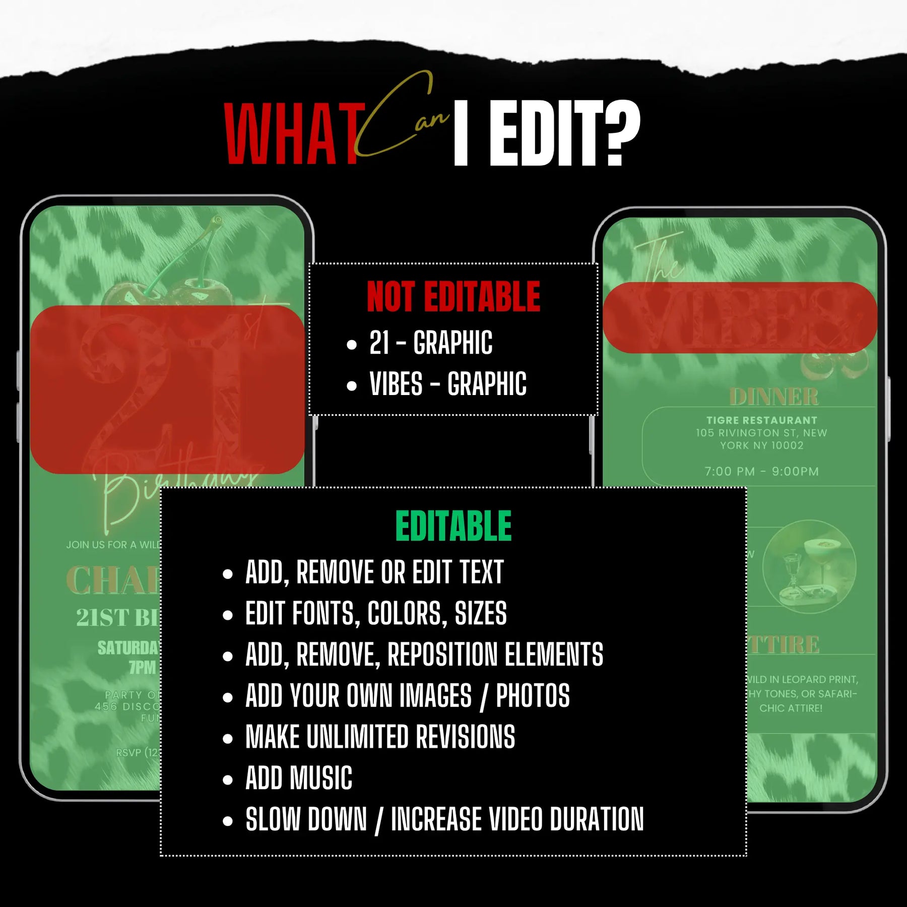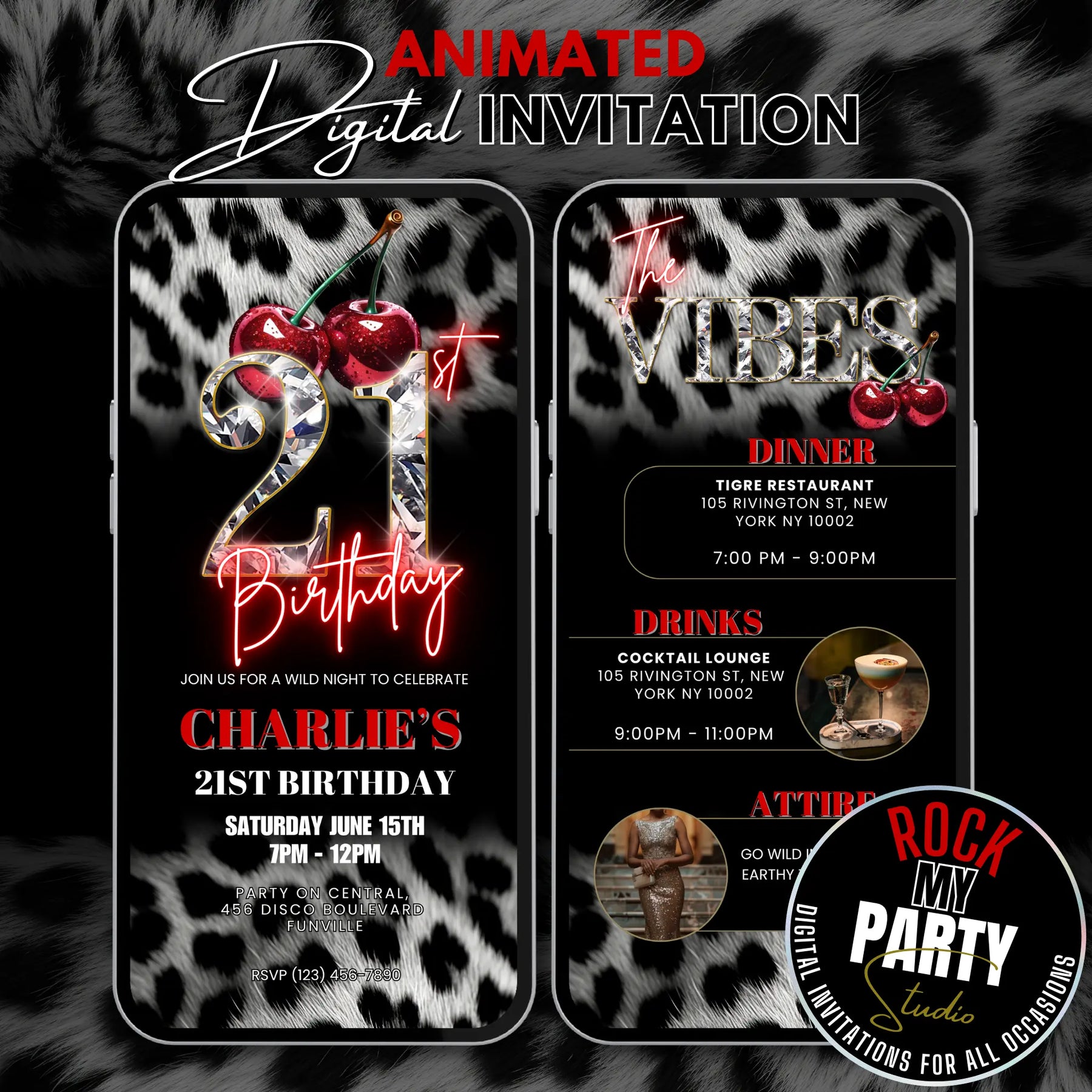 Bring fierce cherry red glam energy to your 21st birthday with this animated Cherry, Cheetah & Leopard Print Invitation. Designed for birthday dinners, cocktails or wild night outs, this self editable Canva template includes a stylish Vibes itinerary to share your event details.