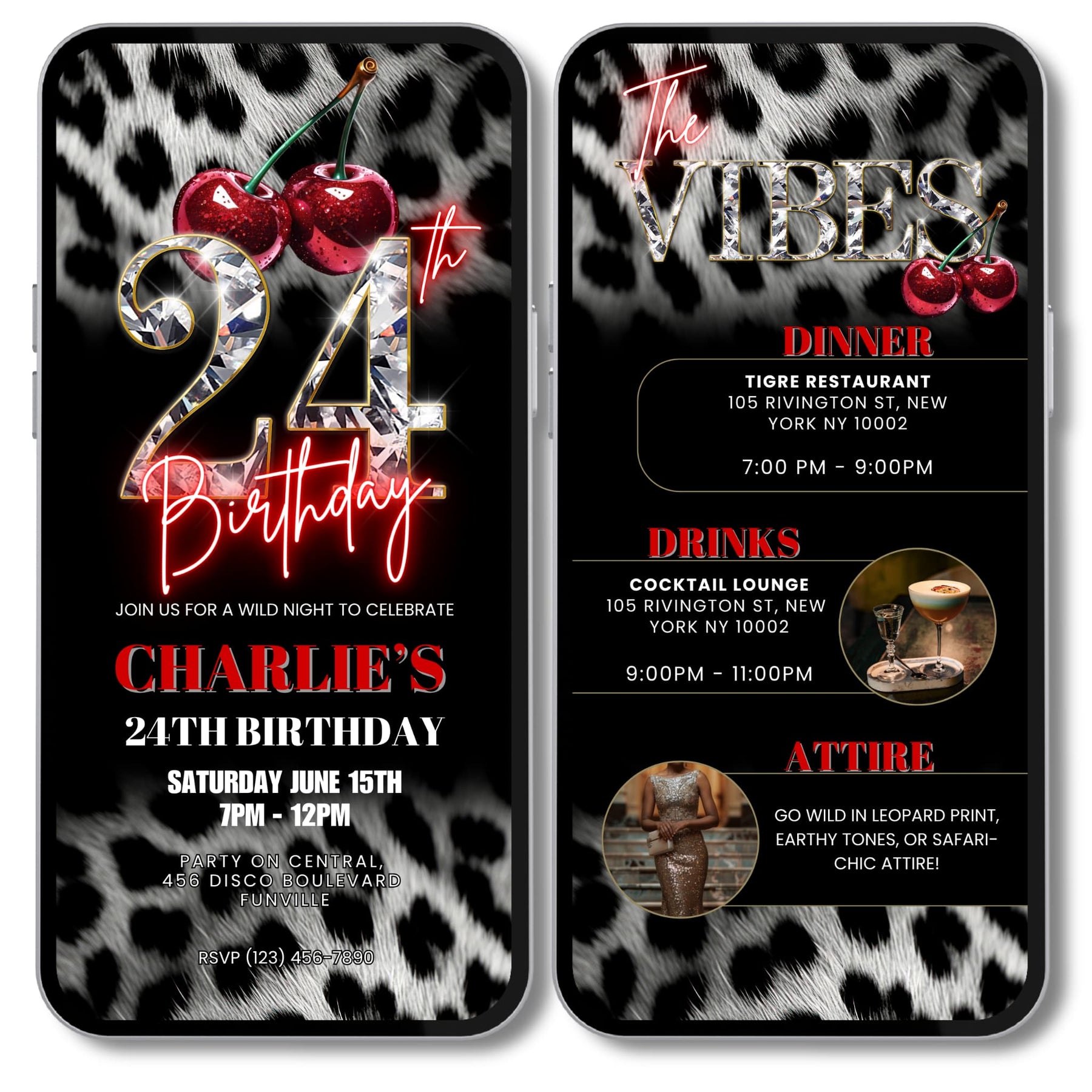 Bring fierce cherry red glam energy to your 24th birthday with this animated Cherry, Cheetah & Leopard Print 24th Birthday Invitation. Designed for birthday dinners, cocktails or wild night outs, this self editable Canva template includes a stylish Vibes itinerary to share your event details.
