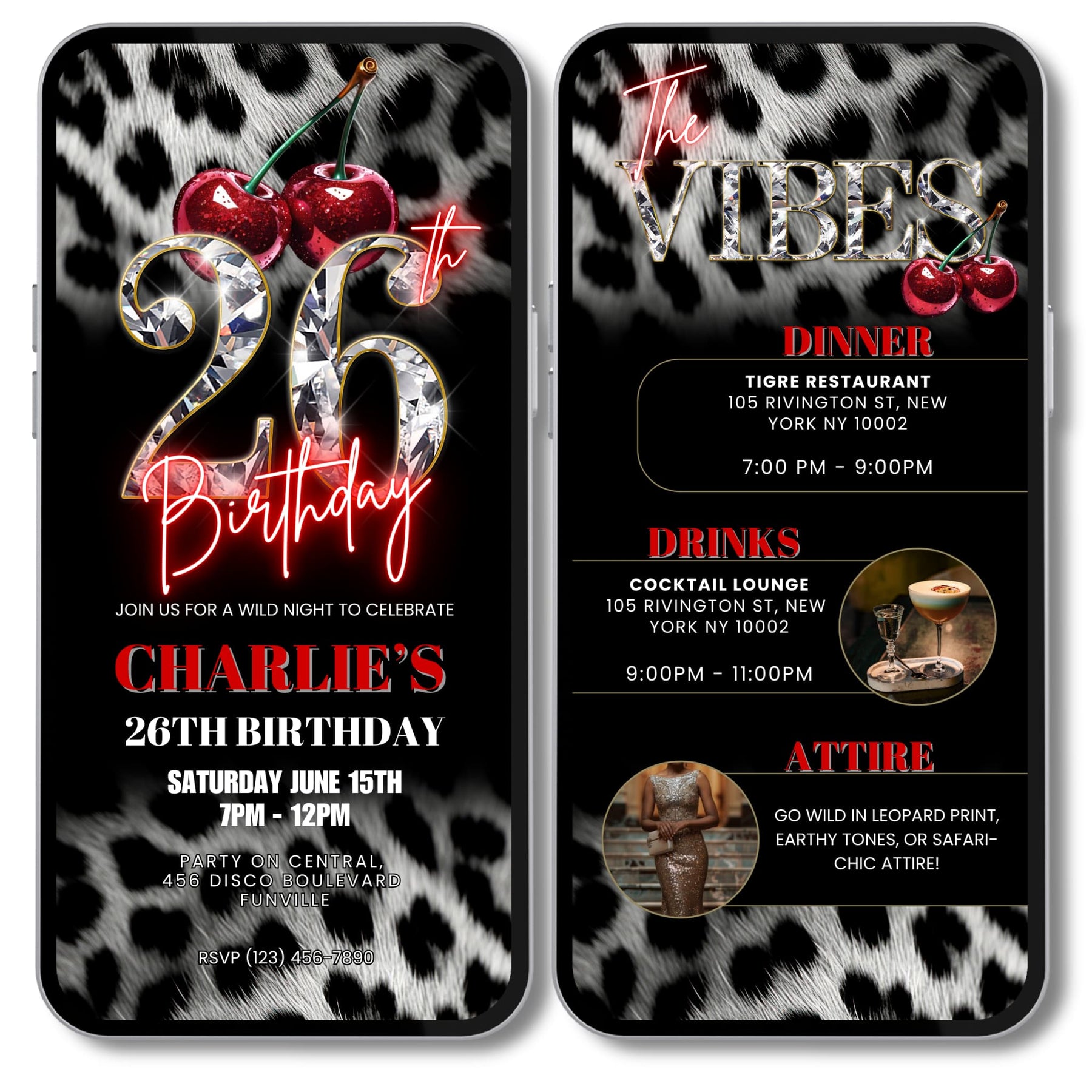 Bring fierce cherry red glam energy to your 26th birthday with this animated Cherry, Cheetah & Leopard Print 26th Birthday Invitation. Designed for birthday dinners, cocktails or wild night outs, this self editable Canva template includes a stylish Vibes itinerary to share your event details.