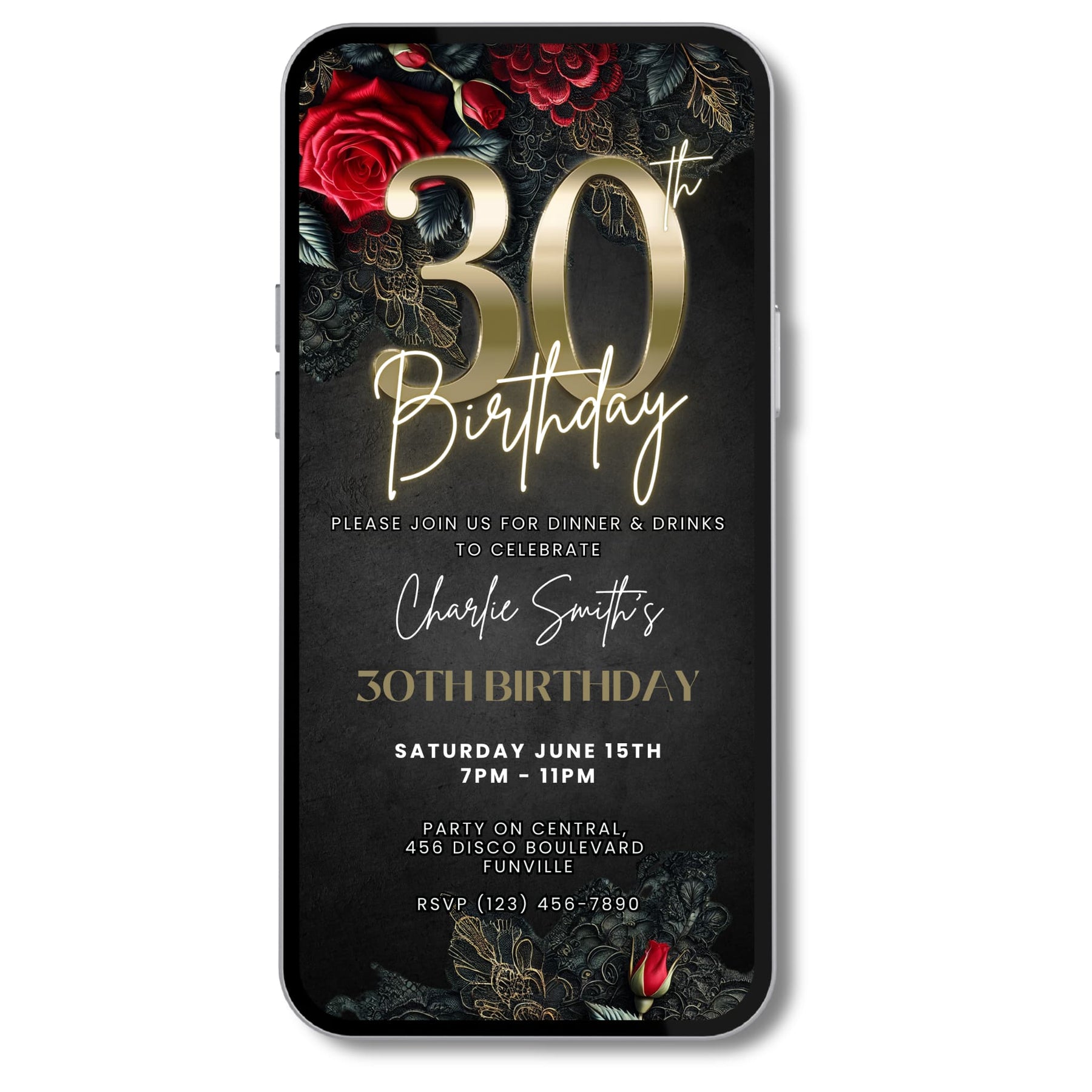 Step into your 30s in fierce, grown and sexy style with this Leather & Lace 30th Birthday Invitation. Designed with rich black leather textures, deep red roses and elegant lace details, this digital evite sets the tone for a glamorous birthday dinner and drinks.