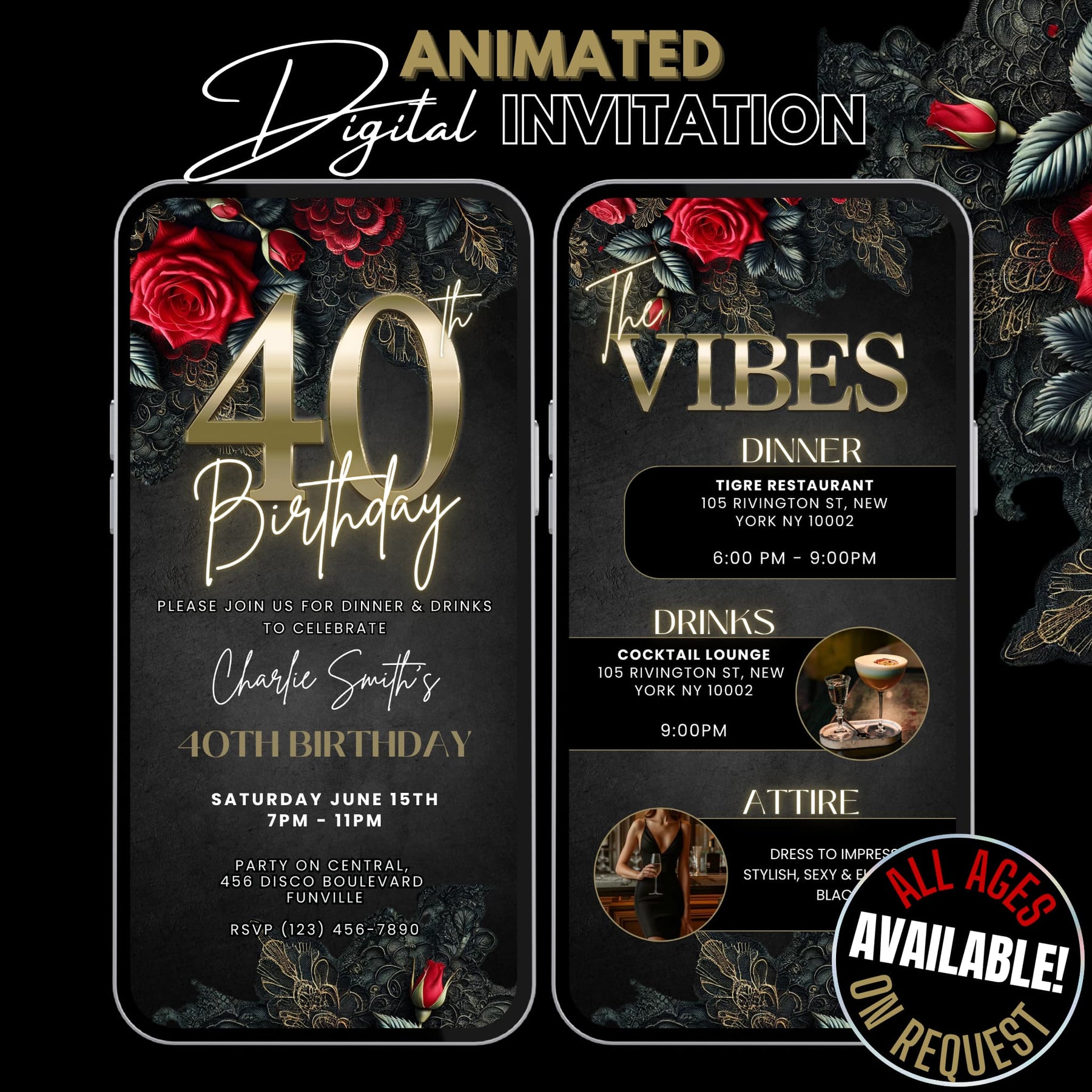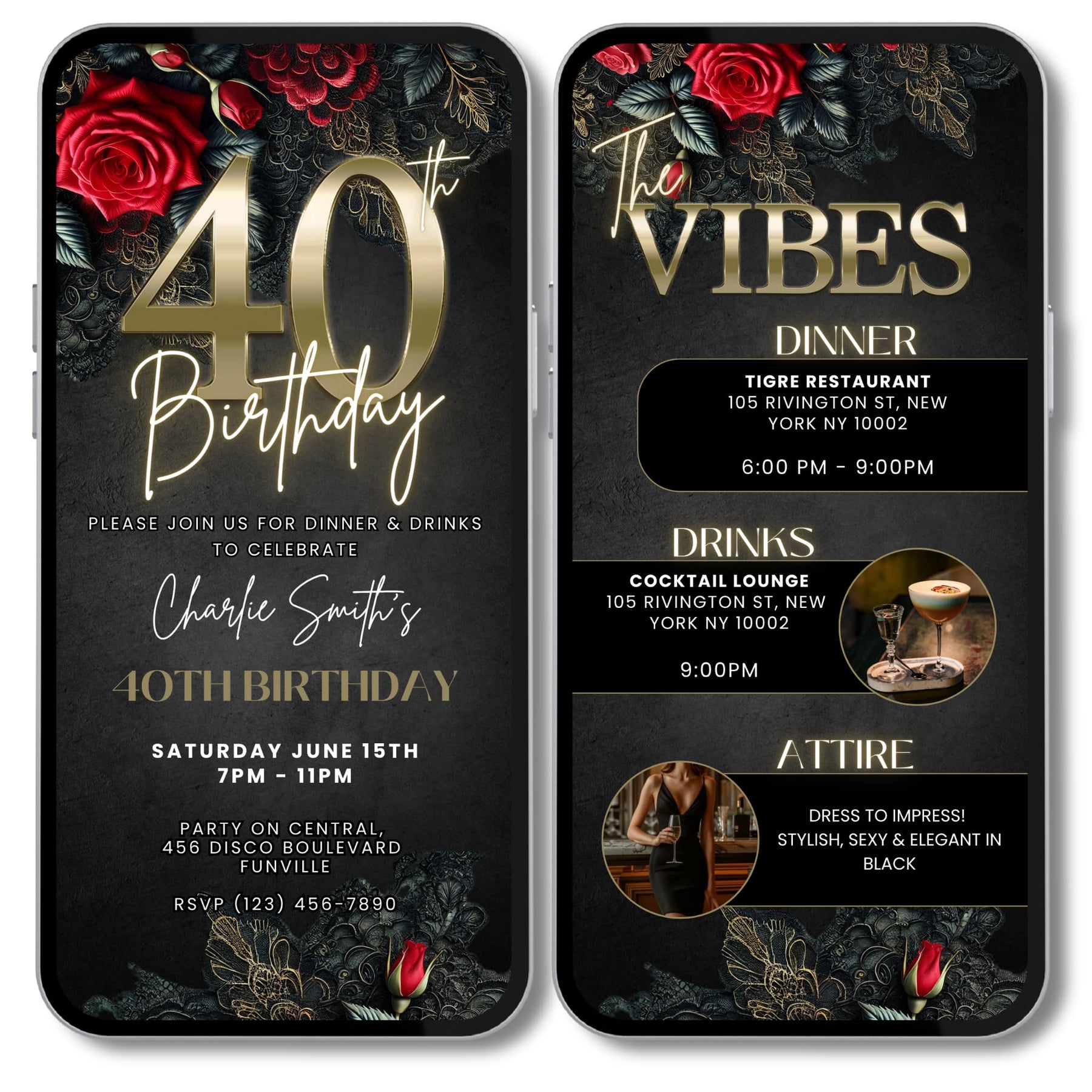 Step into your 40s in fierce, grown and sexy style with this Leather & Lace 40th Birthday Invitation with Vibes. Designed with rich black leather textures, deep red roses and elegant lace details, this digital invite sets the tone for a glamorous birthday dinner and drinks celebration.